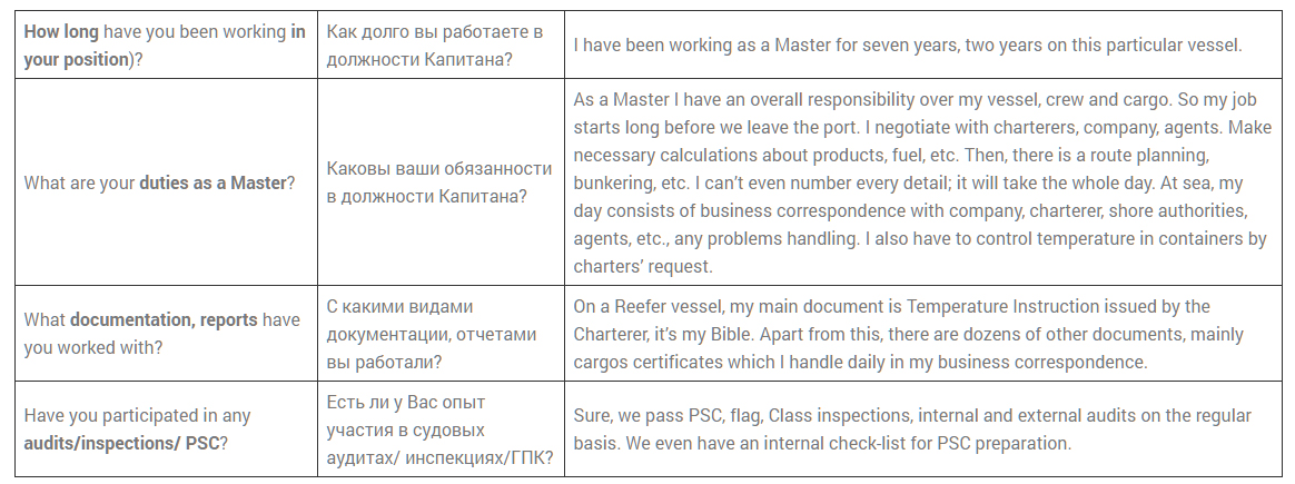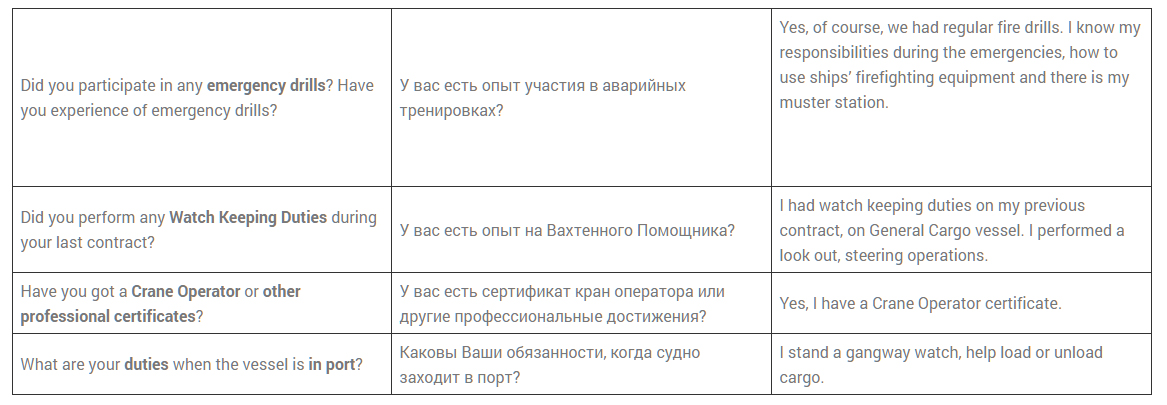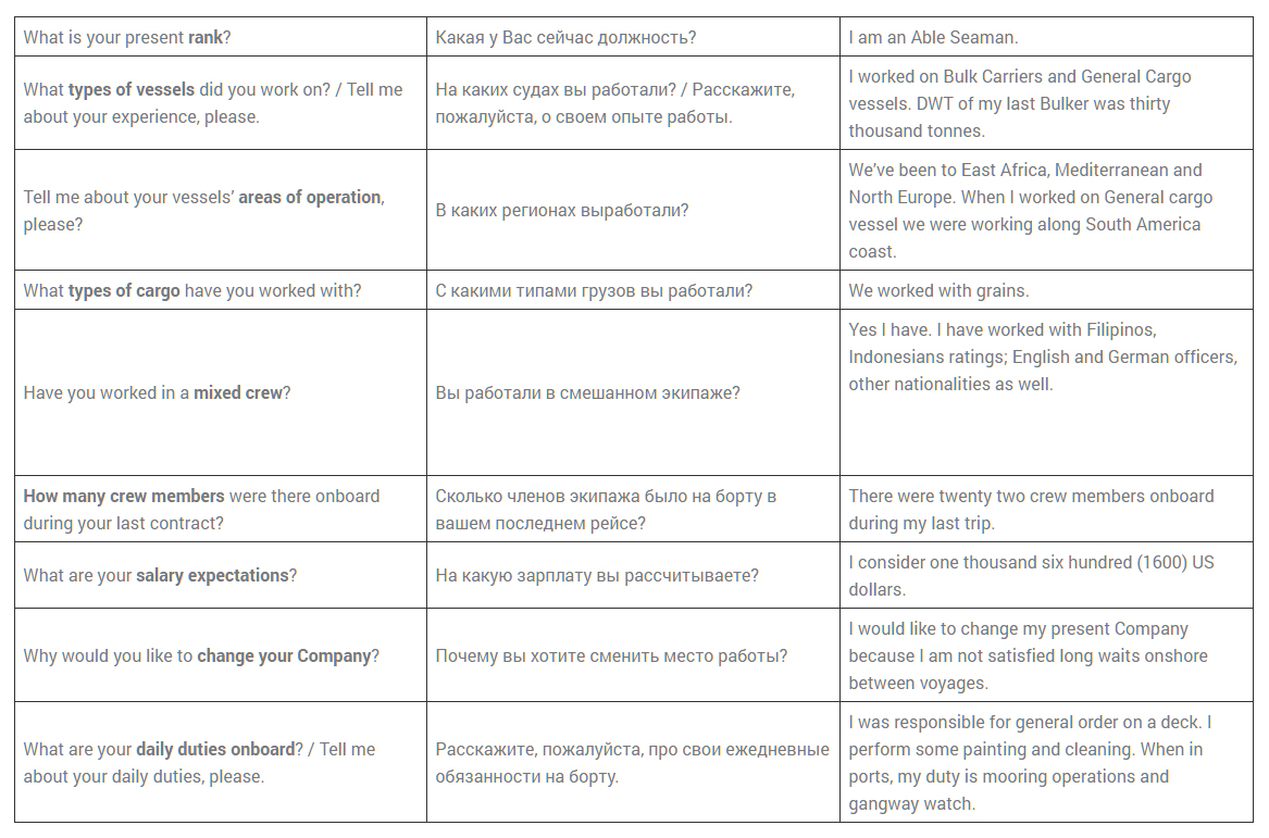 Формулировки вопросов могут меняться, основная задача моряка – услышать их суть. Ведь в конечном итоге именно способность воспринимать английскую речь на слух и отвечать развернуто и по теме является предметом проверки. Иногда менеджер может начать с личных вопросов вроде имени, возраста и семейного положения.