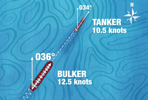 В видеоролике описывается происшествие, случившееся с небольшим танкером (4,829 GRT) и сильно превышающем его в размерах балкером (93,152 GRT) в условиях хорошей погоды и видимости. Оба судна следовали в направлении северо-востока; танкер шел впереди со скоростью 10.5 узлов, балкер – позади со скоростью 12.5 узлов. Вахтенный офицер танкера выходил на мостик, но не заметил приближающегося сзади судна, так как его внимание было сконцентрировано на том, что происходит перед носом теплохода. Когда суда оказались в непосредственной близости друг от друга, из-за гидродинамического взаимодействия танкер начал поворачиваться. Идущий позади теплоход врезался ему в корму, что привело к пробоине и серьезному затоплению меньшего судна.