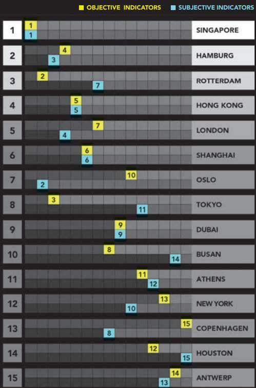 Составители рейтинга опираются как на объективные показатели успешности морских столиц, так и на субъективные мнения представителей индустрии. Из 200 экспертов, которые приняли участие в опросе, порядка 40% находятся в Европе, 30% – в Азии, и 30% – в Америке, Африке и на Ближнем Востоке. По мнению специалистов – крупных судовладельцев и операторов, – к 2024 году в первую пятёрку войдут Шанхай и Дубай. Гамбург, Роттердам, Лондон и Осло сохранят лидерство в Европе, однако первое место все также будет удерживать Сингапур.