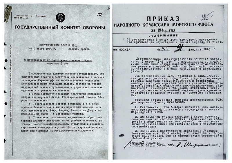 Ровно 82 года назад, 5 марта 1944 года, Государственный Комитет Обороны СССР принял Постановление № 5311 «О мероприятиях по подготовке командных кадров морского флота»: существовавшие ранее в системе Наркомморфлота морские техникумы были реорганизованы в мореходные и высшие мореходные училища.