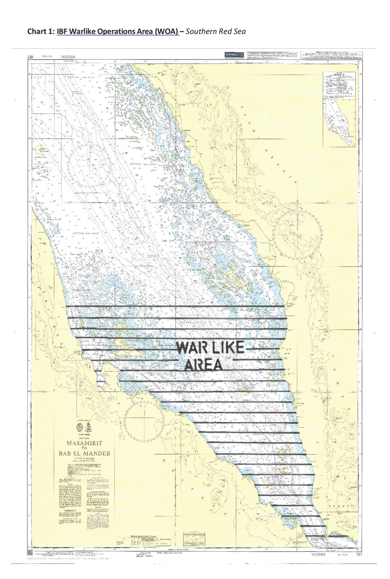 1. Зона боевых действий IBF – 12 морских миль от материкового побережья Йемена, включая все порты, за исключением транзитного коридора морской безопасности (MSTC) в Красном море (диаграммы 1 и 2). Действует до 25 мая 2026 года с возможностью продления.